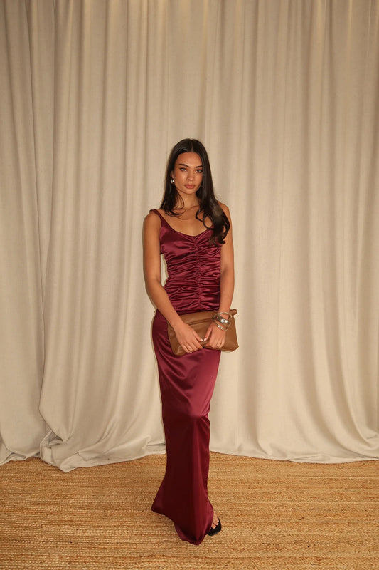 GATHERED STRAPLESS BLACK SATIN GOWN