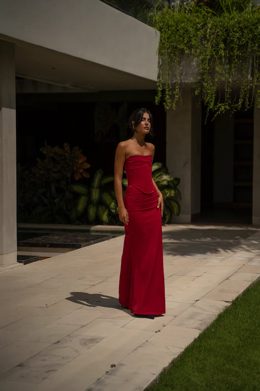 RED ASYMMETRICAL GAMES STRAPLESS GOWN