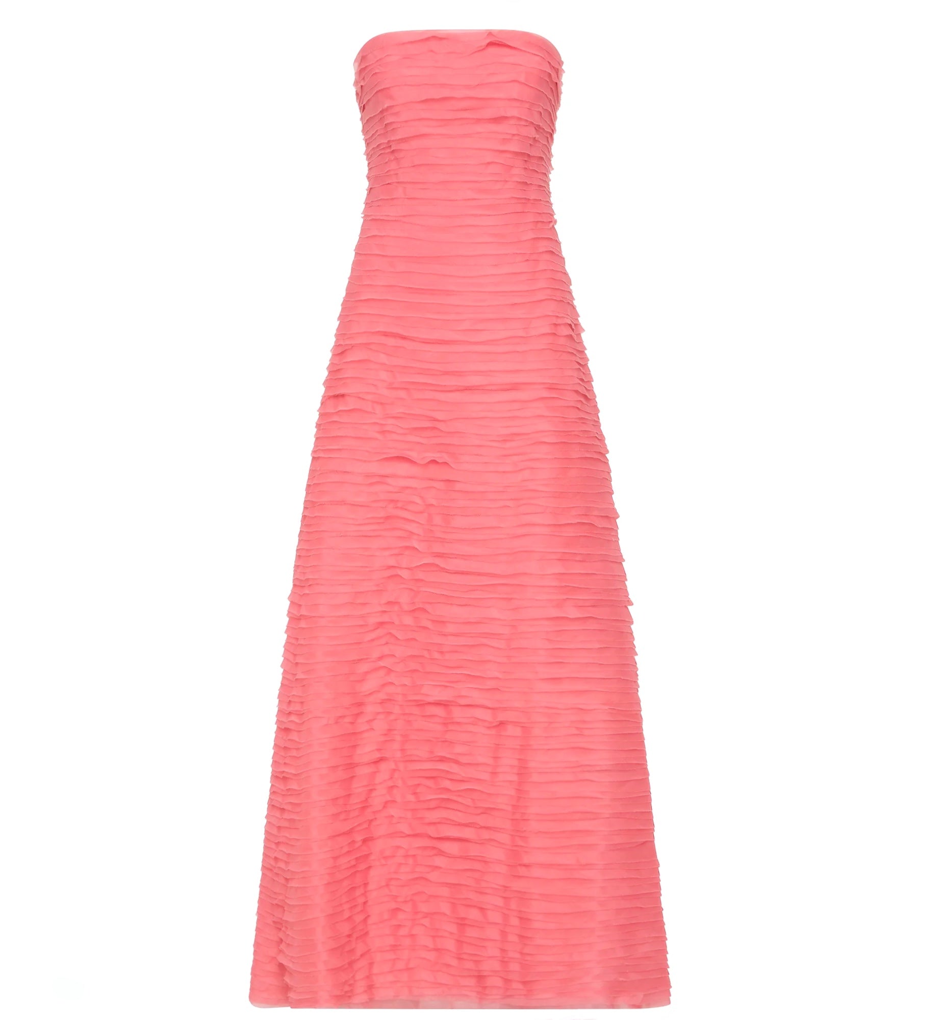 Our Aje Soundscape maxi is a strapless dress with horizontal organza frills throughout. The dress has a fitted bodice with internal boning and a voluminous skirt.
