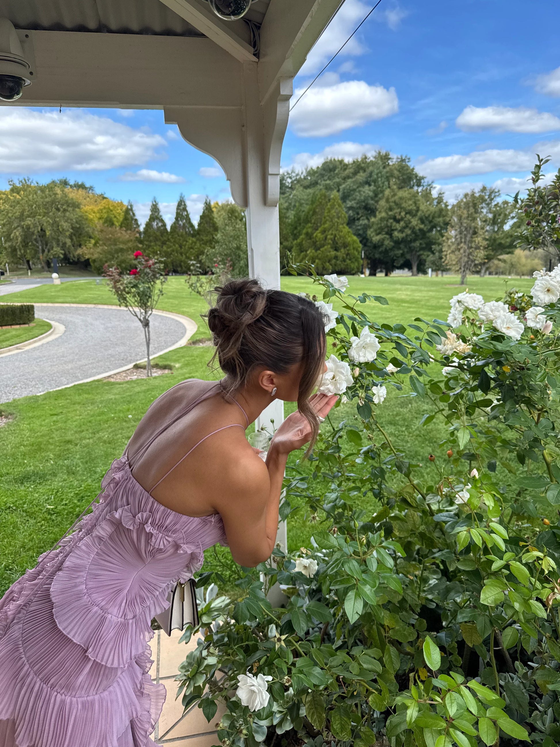 In a dreamy dusty lilac, this halter gown is an ode to movement and form. Lily pad-inspired pleating swirls across the bodice, cascading into soft ruffles that mimic water currents.