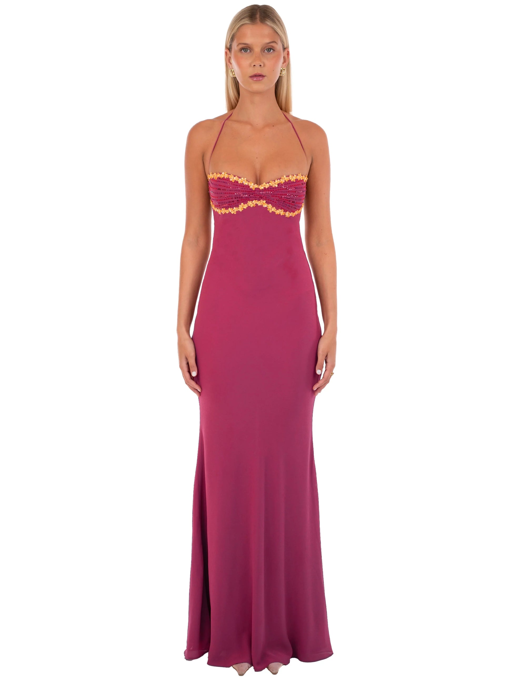 A romantic chiffon maxi dress featuring a sweetheart neckline, halter ties, and a flowing flared hem. Designed with contrast lace trim and delicate hand-beaded detailing at the bust. The bias-cut silhouette is fully double-lined with a slightly sheer finish, while an elasticated lower back ensures comfort and fit. Finished with adjustable back ties for ease of wear.
